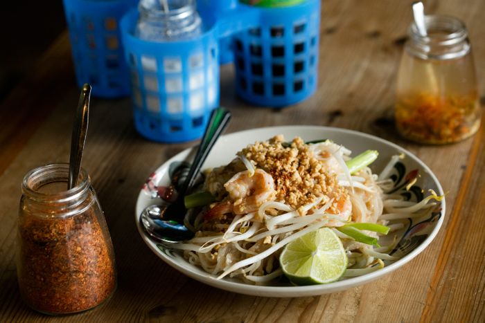 “Respect others please be quiet,” reads a red sign, a nod to the fact that this offshoot of Thai noodle sensation Pata Paplean is often packed with schoolchildren. Most order hot dogs and French fries, but “some of the Filipino kids get pad Thai,” says Suchasinee Nitmai, who handles the front of the house while her mother, Sunisa, whips up homestyle favorites including papaya salad with preserved crab and pickled fish and num tok beef dressed with red onion, mint, lime juice, and chiles. Roasted rice powder lends a pleasant nuttiness to the beefy salad. Specials include khanom jeen ya poo, rice noodles served with a sidecar of crab in a yellow curry that gets its color from hand-ground turmeric and its flavor from galangal, chile, and lemongrass. It comes with a platter of fresh herbs. Mix the whole lot together and dig into a real Thai after-school special.