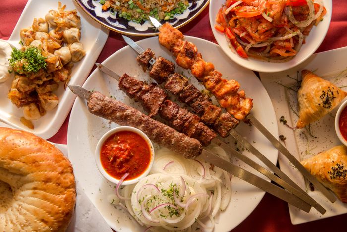 The word is out about this Uzbek restaurant — enough so that owner Boris Bangiev opened an outpost in Park Slope in 2017. Still, a meal in the original Nargis’s sprawling and festively tapestried dining room remains a singular treat. Cooks marinate chunks of lamb, beef, and veal with sliced onions and knobs of fat, then use hair-dryer blasts to supercharge the charcoal grill, turning out beautifully blistered and juicy kebabs. The squat, beef-filled chuchvara dumplings are topped with a confetti of caramelized onions, and the Uzbek-style plov (rice pilaf with carrots, lamb, and chickpeas) shimmers seductively. Pro tip: Order a plate of pickled red cabbage, tomatoes, and cucumbers for a bit of reviving contrast.