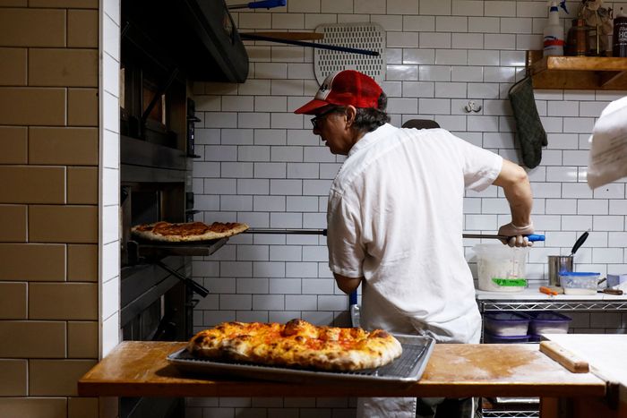 With its red neon sign that reads “PIZZA,” and a painting of a square slice dappled with mozzarella accompanied by the words “Artisan pizza” and “72h fermented,” Philomena’s at first looks like just another fancy-pants pizzeria, but the counter service joint is actually home to some of the best ’za in New York City. The lineup of 18 personal pies ranges from classics like marinara and margherita to originals like the Jersey Shore — tomatoes with sweet and spicy sausage, mozzarella, peppers, and onions — designed to evoke owner, lead pizzaiolo, and self-professed dough nerd Dave Acocella’s childhood memories of sausage and pepper heroes. Acocella trained with Neapolitan master Gino Sorbillo and New York pizza guru Paulie Gee and it shows in his crunchy square slices. They change daily and include escarole with a shmear of white bean topped with pignoli nuts, a stellar pepperoni, and the carb-on-carb potato with oregano and olive oil. Covered in ultrathin slices of potato that crisp and caramelize along the slice’s perimeter, the latter is a recipe that comes from another one of his mentors, his mother.