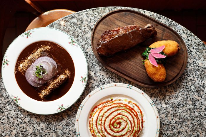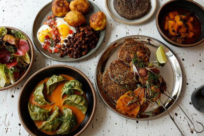 Dawa Bhuti’s restaurant, decorated with Buddhist imagery, has the distinction of being the only New American/Himalayan hybrid in all of New York City. The vet of the Mercer Kitchen and Reynard cooks side by side with her father, Ngodup Gyaltsen. Momos, the dumplings beloved throughout the Himalayas, lead off the Himalayan-inspired side of the menu. Bhuti says her momos, luxuriating in shallow pools of tomato sauce flavored with fenugreek, and finished with emma, as Sichuan peppercorn is called in Nepal, are inspired by those served at roadside stands in Kathmandu. Creamy beef tongue with Chinese black-bean chili paste served with a fluffy piping-hot whole-wheat tingmo bun is lovely. Whole wheat also plays a role in bartsa margu, rustic gnochetti pasta sautéed with butter, carraway, and kale that tastes positively Scandinavian. The bottom of the Himalayan menu reads, “CHECK NEW AMERICAN MENU AT BACK.” There you’ll find a delicious seared duck breast served with a sauce of lemon, olive oil, and pear, shishitos, and purple rice.