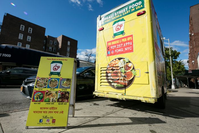 Across the street from Raja Sweets & Fast Food, Delicias Caleñas, and Dosa Delight lies a cheery yellow-green-and-red cart bearing the words “The first fuchka cart in USA.” Inside, two Bangladeshi gents clad in polo shirts with the same color scheme as the cart and the tagline “I was made to satisfy you” prepare a specialty more common on the streets of Dhaka than Jackson Heights. Fuchka are golden fried shells of semolina and rice flour filled with potatoes and yellow split peas and topped with red onions, grated hard-boiled egg, and a masala made from 16 secret ingredients. They ring a pool of sour tamarind water seasoned with a tinge of the sulfury Bangla black salt called bitnoon. Pour a bit of the liquid into the opening of one of the globes and pop the whole thing into your mouth. One shattering bite gives way to a wave of textures — creamy potatoes, crunchy shell — and flavors, spicy, sweet, and nutty. It’s a combination that was indeed made to satisfy. (Daily