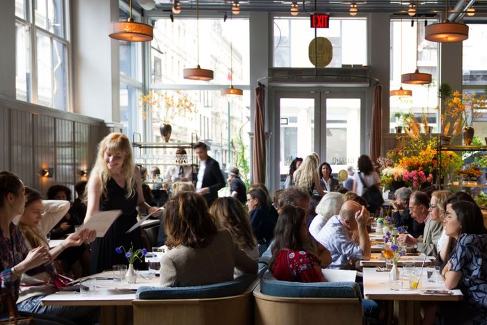 Like all great Parisian cafés, Marie-Aude Rose’s stylish little downtown dine-and-shop operation (it’s located in the front of a Soho boutique) has a little something for everyone — including, if you wish, bundles of fresh-cut flowers that you can order when you arrive for your lobster salad or bowl of chestnut velouté, and pick up after you’ve finished eating. Our favorite meal is breakfast, when the kitchen serves bowls of crème anglaise with slices of warm brioche and the sun slants into the room in a particularly Parisian way, but you can get a superior version of boeuf bourguignon starting at lunchtime, along with a fine selection of that durable Breton-style speciality, buckwheat crêpes, which the kitchen folds with creamed chicken, and serves, speckled with sugar and a squeeze of lemon, for dessert.