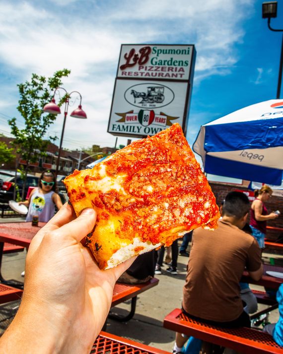 Another is Saraghina in Bed-Stuy (435 Halsey St.), where the crust on the Neapolitan pizza exhibits a range of appealing textures, from crisp and chewy to light and airy, and the tranquil garden out back successfully mingles the barnyard with the junkyard. And then there’s Roberta’s (261 Moore St., East Williamsburg). The last time we dined alfresco here, it took about 12 conversations with ten eccentrically costumed servers before our margherita arrived at our picnic table, by which time we had grown a full beard and seemingly aged five years. Now this place runs like a Swiss watch: You place your order at the assembly-line takeout annex down the street and return at the appointed time. Then you toddle over with your pizza in tow to the adjacent and spacious tiki-bar patio, where you can wash down your pie with an Aperol spritz in a plastic cup. If you want the ultimate pizza-en-plein-air experience, though, you’ve got to travel farther south and also back in time, to the holy grail of the Sicilian square, to L&B Spumoni Gardens in Gravesend (2725 86th St.), where the scene on a recent Saturday night was like American Graffiti meets GoodFellas with a little Fellini thrown in for good measure. The square pie is probably as good as it was when Ludovico Barbati debuted it some 80 years ago. But what’s great and amazing about L&B Spumoni Gardens, besides the name and the pizza and the ritual and the fact that it’s essentially a slice joint with a parking lot, is the very idea of L&B Spumoni Gardens. How could such a wonderfully weird place ever exist? Imagine if it never did, and some budding young gastropreneur were giving a Shark Tank–like group of investors the elevator pitch today: “Just picture it: Sicilian pizza but—get this—with the cheese under the sauce, sold by the slice or whole pie from separate takeout windows, and eaten in what looks like a beer garden with the feel of a ’50s-era drive-thru burger joint, named after an Italian immigrant and the horse that pulled his food wagon. Plus, of course, spumoni.”