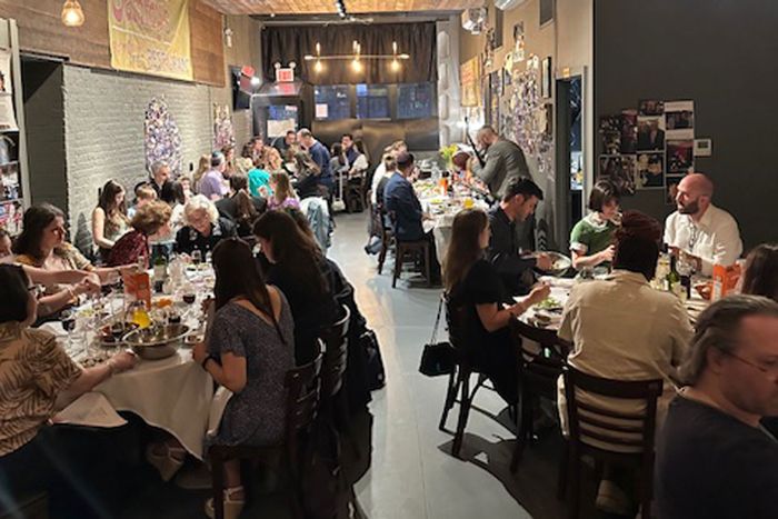 Now Sammy’s has reopened, and though the battered metal sign that used to announce it on the street now hangs indoors, things are as they ever were. The vodka (Ketel One or Tito’s now — diners’ choice) still arrives in an ice block, whose melting sides will begin sloshing around once you’re too sloshed to care. Seltzer is still dispensed via siphon. Shmaltz still sits on every tabletop, and platters of garlicky steak, kreplach, latkes, and sausage still keep coming until you beg them to stop. (There’s no “ordering” at Sammy’s — as at a relative’s house, you just submit.) Dani Luv (né Lubnitzki) still does his musical borscht-belt patter from the back of the room, coaxing circle dances out of sozzled tables of touristing blondes and belting the classics, improving the unimprovable American songbook with tweaks like, “Jingle bells, jingle bells / Jesus was a Jew.” (This is in May, mind.) Luv, who looks like the love child of Danny DeVito and Wallace Shawn, is as much an institution as Sammy’s itself, and his patter has aged like fine slivovitz.