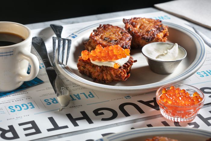 Late-night carb seekers know to head to the East Village’s 24-hour Eastern European outpost. Along with pierogi, stuffed cabbage, and other classics, the latkes serve serious comfort-food vibes. The snow-white interior — essentially a mound of finely shredded hash browns — is bound by a crackly crust. They are tasty as is, but even better serving as the starchy base for Veselka’s salmon and latke eggs Benedict.