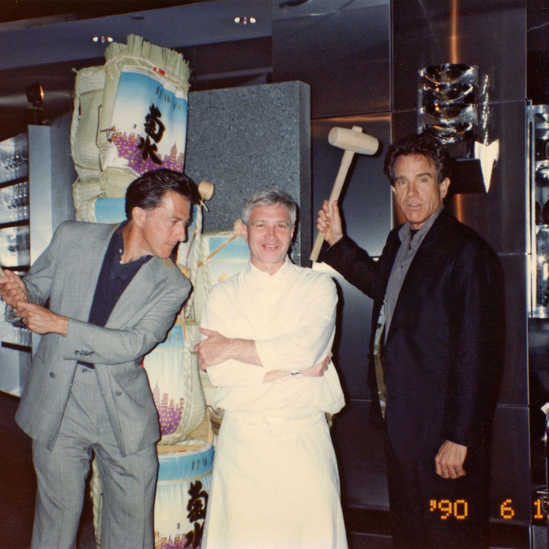 We’re sitting on the expansive patio of his Chelsea penthouse and flipping through a stack of sticky old photos, admiring the glittering array of regulars who populated the various iterations of his restaurant back in the day: Craig Claiborne; Brooke Astor; Jasper Johns jauntily holding a pour of sake; Warren Beatty grinning next to a beggar’s purse propped on a candelabra and topped with gold leaf. Wine first encountered the dish in a restaurant outside Paris, where it was served in the nouvelle cuisine style on a simple white plate. Returning home to New York, Wine added the gold leaf and the candlestick, instructing diners to eat the bite in a sensual manner without their hands. “I don’t mean to be lewd or cynical, but this is what we decided people wanted to have,” he recalls. After a few years, he added another kinky wrinkle: pairs of handcuffs that would be locked to lamps or chairs or sconces on the wall — an innovation that, judging by the look on Beatty’s face, seemed to suit the racy, coke-addled clientele of the day just fine.