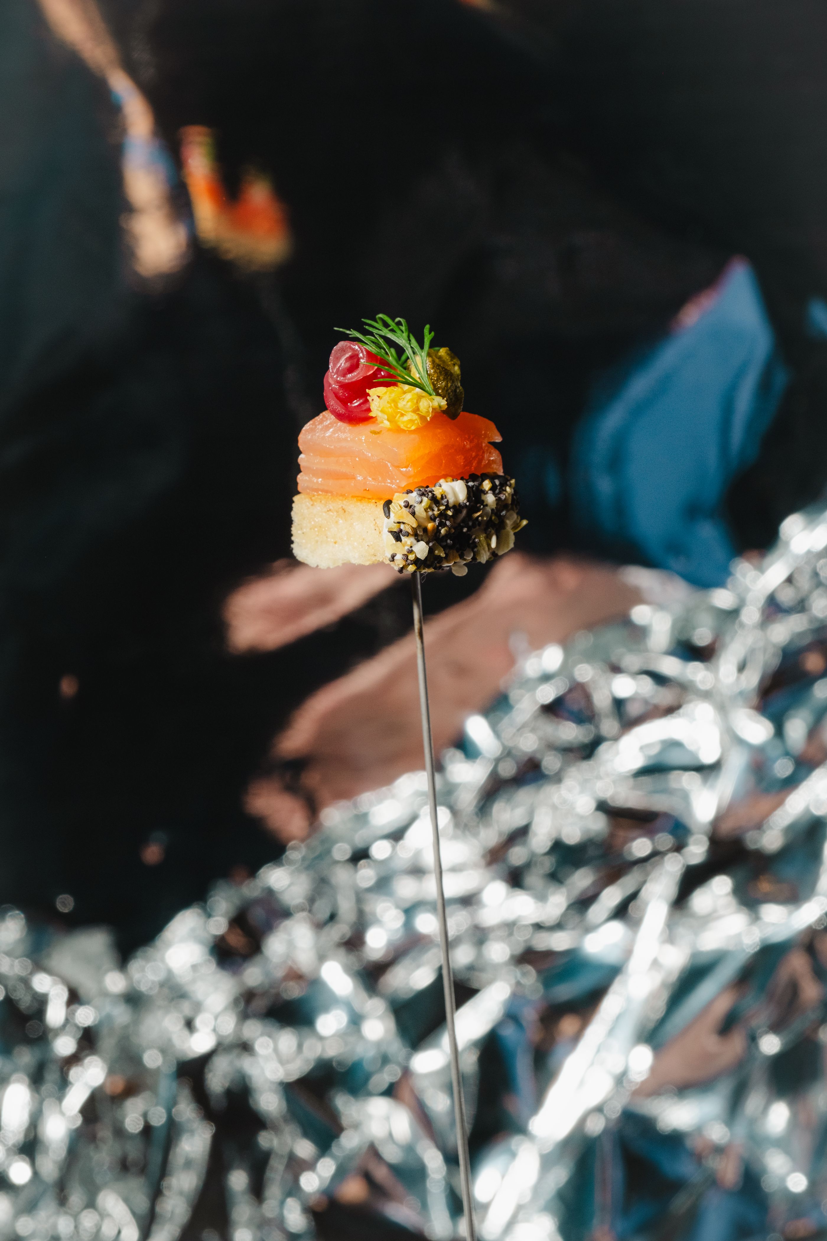 Every meal starts in the library. On an antique desk, an Underwood typewriter has a single sheet of paper in its maw. “Take What Is Yours.” An open guest book sits on an armchair, fountain pen uncapped. From a record player next to a sepia-toned globe, lit by long tapered candles, Leoš Janáček’s “Sinfonietta” crackles and pops. The first course is had by the window where a contraption made of multiple antennae sits. At the tip of each rod, like the inflorescence of a cattail, is a tiny square of everything bagel topped with lox, pickled red onion, a fried caper, whipped cream cheese, and dill.