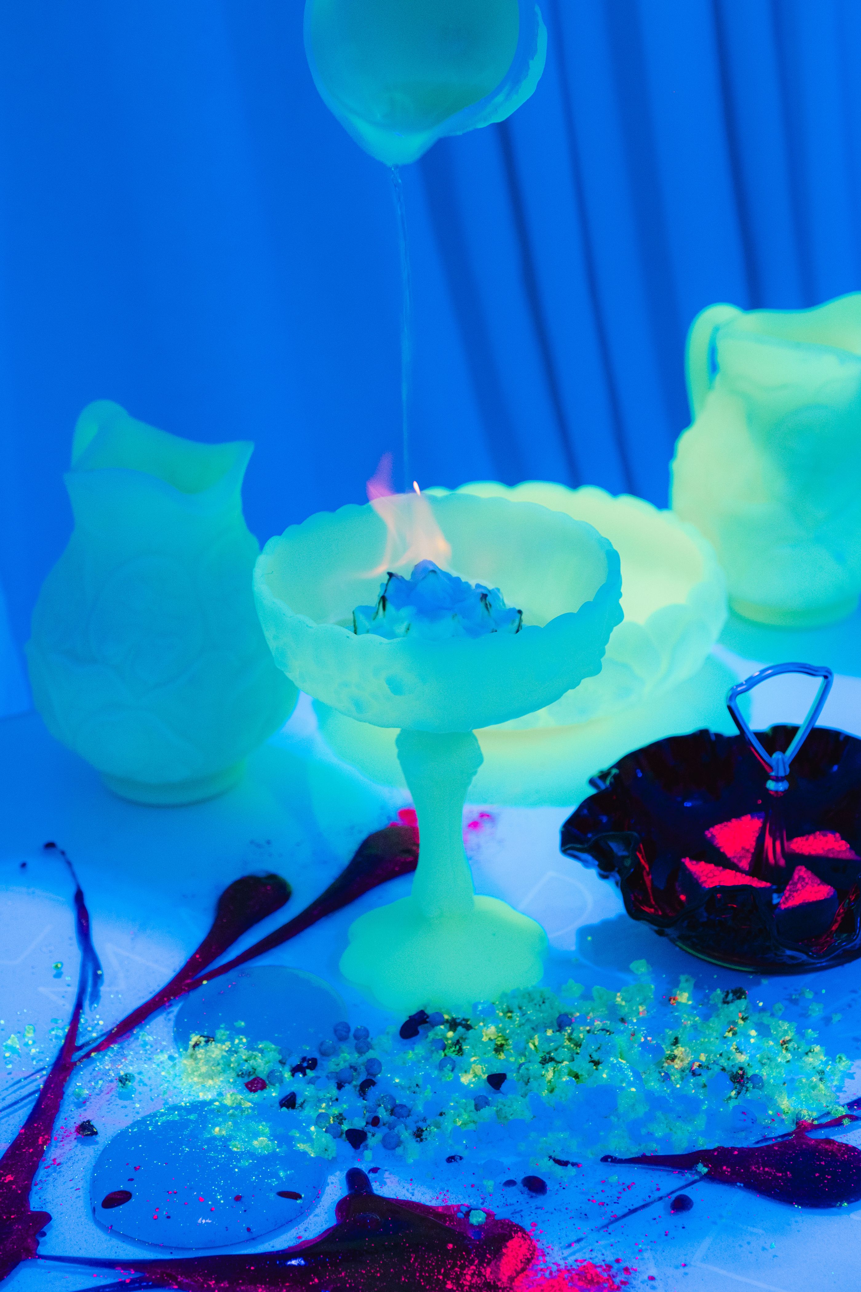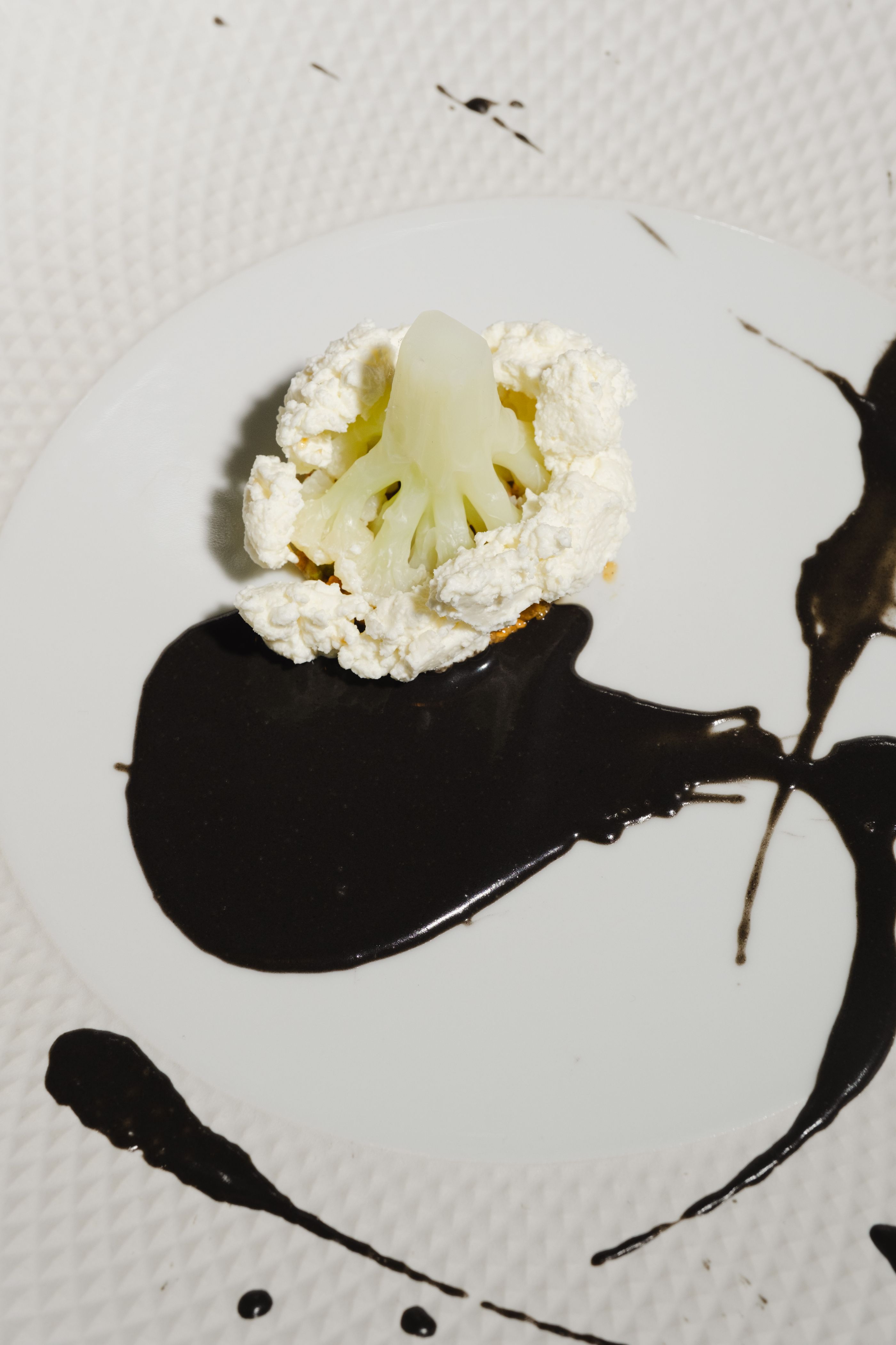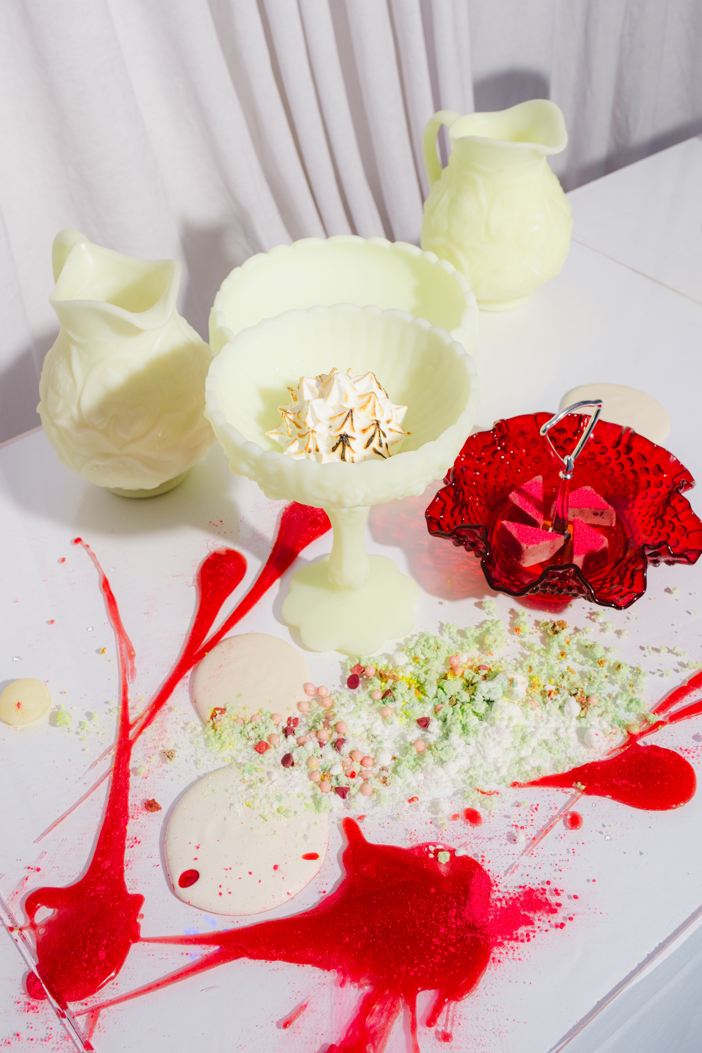 Then it’s time to go outside, where employees gamely hold umbrellas on the deserted street. (By this time, it is around midnight.) We cross the street into Amorina, whose owner is on a monthlong Alinea-sponsored vacation. The entire space is shrouded in white fabric. The tables are white; the staff wear white slippers, and the floor is photo-studio white too. A procession of chefs stream from the kitchen in single-line formation. Each holds a yellow chalice that they set upon the table. In it sits a baked Alaska made with barrel-stave-smoked ice cream. They torch the meringue. It’s all very The Menu meets Wild Wild Country. In front of each table, the chef swoops and swooshes ruby-red syrups and taupe puddles. This is the famous Paint dessert (known in the kitchen as the Mat Set). They shuffle away. Suddenly, the lights change to black light and the Beastie Boys’ “No Sleep Till Brooklyn” begins to blare. In the light, the antique glass goblets glow a psychedelic yellow. The cherry swirls emit an Upside Down glow, and the banana sauce radiates a faint uranium glimmer.
