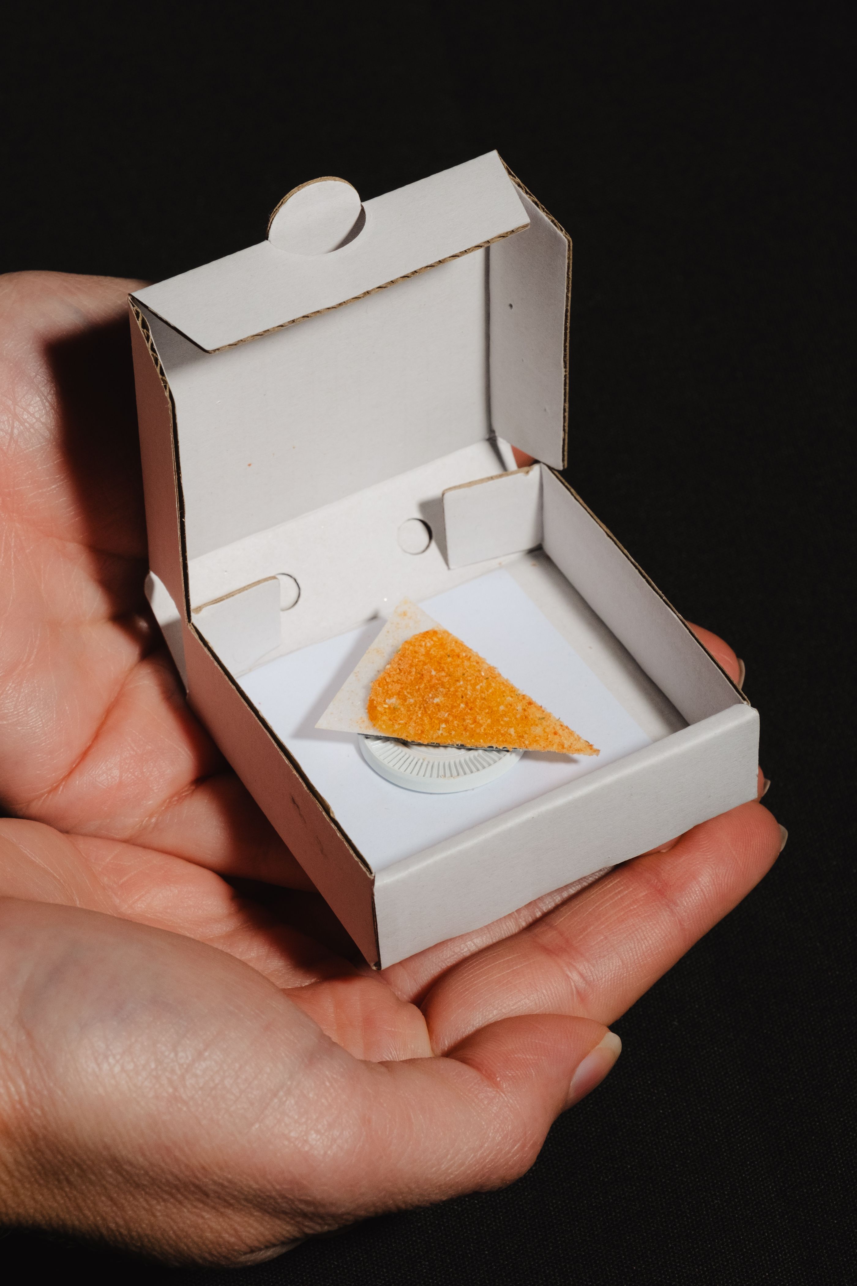 On the bookshelves, beside the Escoffiers and Phaidons, sit multiple novels by Haruki Murakami. They are large with bright-red spines and bold white letters. A suited server instructs guests to pluck the book from the shelf. Achatz says he was inspired by a particular scene in Murakami’s 2002 novel Kafka on the Shore. “It’s about time and reflection and projection, so we wanted to have elements of the past, the present, and future,” he told me after the meal. These are not books at all but booklike boxes. Inside the hollow cavity is a small flashlight, a teensy-weensy pizza box, and a card on which is written a pair of rhyming couplets. “You’ll need the flashlight later,” instructs a server.