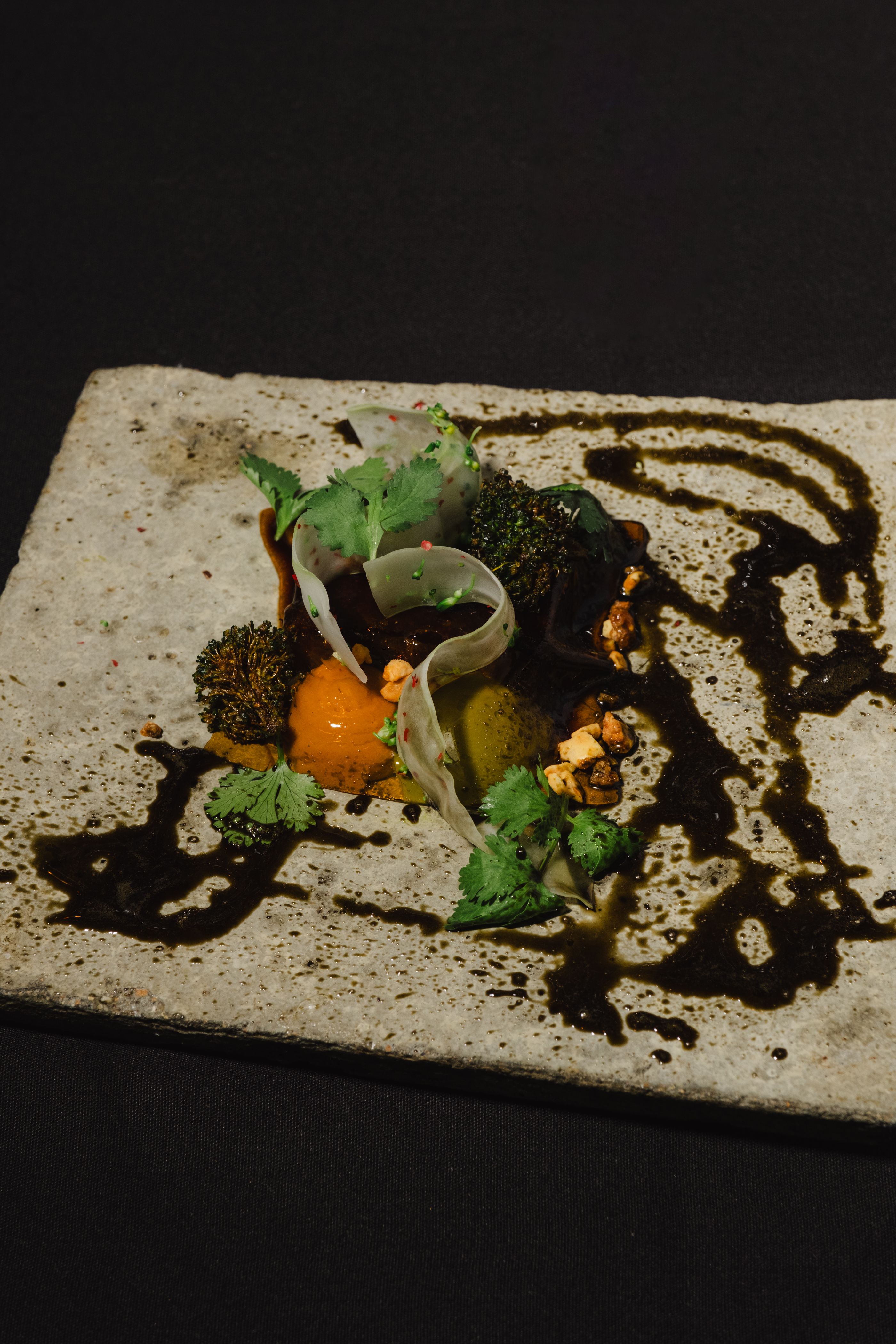 This sets off an unceasing procession of courses; five courses are served in the back garden. Few involve a traditional knife and fork. “The monotony of fork, knife, and spoon that we do our whole lives,” says Achatz, “it becomes second nature. We have to break that. It’s a little alarming, a little different.” Caviar, for instance, that sits atop a disk of pineapple gelée studded with vesicles of finger lime, arrives in a curved pebbled glass meant to tactilely mimic the experience of caviar itself. That vessel, alongside 3,000 pounds of other material, arrived in a shipping container and two vans from Chicago a few days before. A course called “explosion,” an Alinea mainstay, consists of a black truffle, Parmesan raviolo served on a single spoon with no plate at all. “Make sure you seal your lips around it,” says the server. Brown-butter fried frog legs are served beside potted Brooklyn evergreens doused in scented water. A nod to Chinese takeout, beef and broccoli (Australian Wagyu short rib, broccoli stem, broccoli purée, fried florets, razor-shaved broccoli cells) is served atop a hot slab of concrete and finished with a Brooklyn Brewery beer gelée “graffiti.”