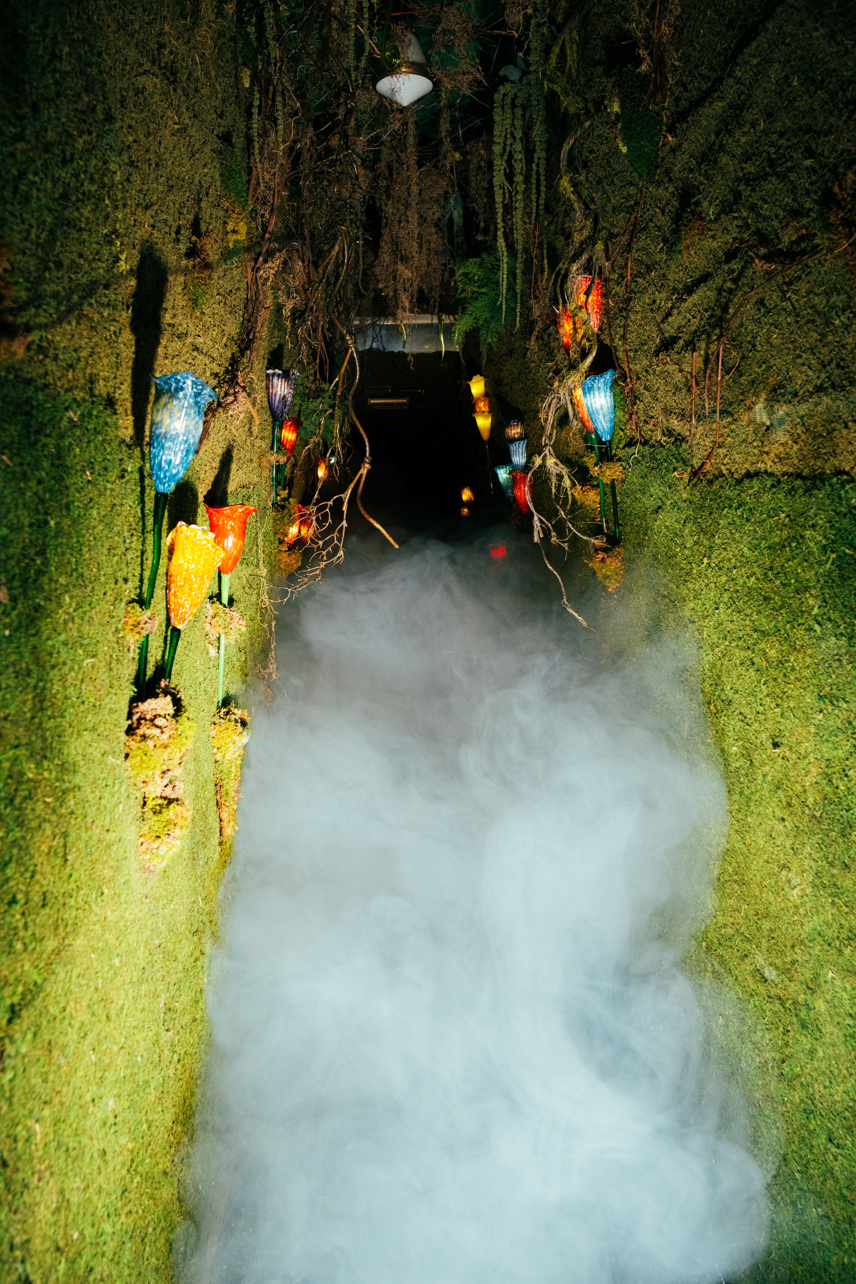 Hot dog slurped, we are bidden to examine the poetry written on the card found inside the faux Murakami: “Mushrooms sprout where shadows creep / The path is dark, the roots run deep. / Take your flashlight, hold it tight — You’ll need its glow to guide the night.” With that, we’re led through a moss-lined hallway into the back garden. Along the walls, in custom-made glass vessels, are puffed porcini-mushroom crisps with pine-nut mushroom butter. We pluck and eat, deposit our flashlights, and continue into the backyard.