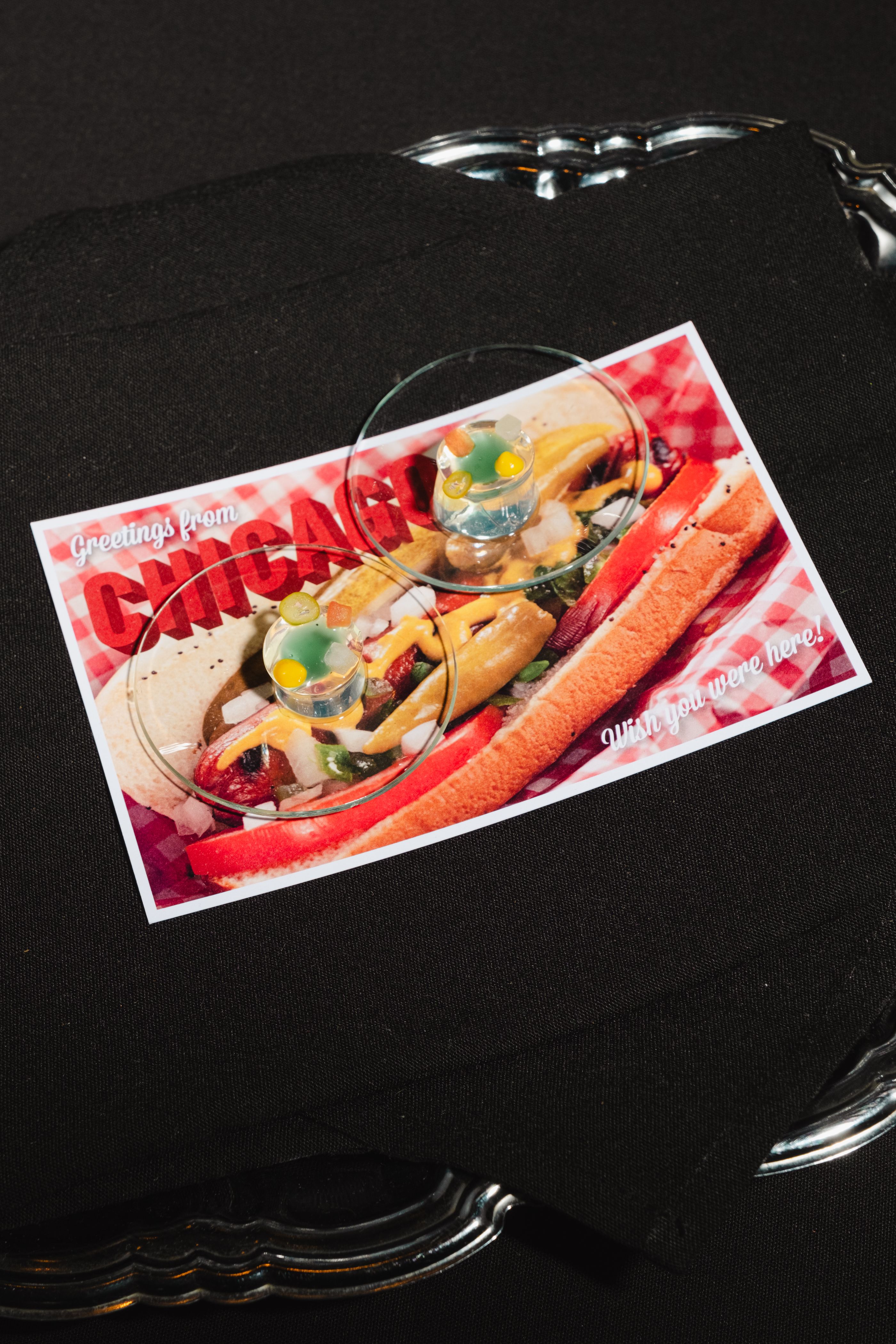 Inside the pizza box is the second course: a small triangle of rice paper (very thin crust!) on which the flavors of pizza — dehydrated ground pizza crust, mozzarella powder, tomato powder, and a bunch of other powders — are affixed. “Let it dissolve on your tongue,” says another server. (There are many servers.) The final course in the library, melding future and past, is a “Chicago dog”: two discs of translucent hot-dog water — made of charred hot-dog stock run through a rotary evaporator — topped with a tiny brunoise of tomato, compressed onion, a slice of sport pepper, and a neon-green relish fluid gel. Each sits atop a monocle, which itself rests upon a postcard of Chicago.