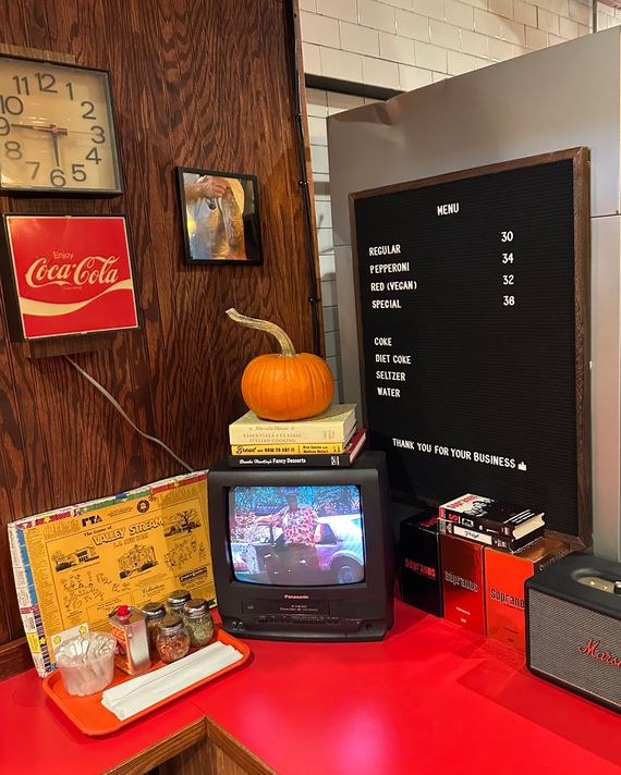 The shop has room for maybe six or seven people to eat at the tomato-red laminated counter. Most of the decorations on the walls are references to Valley Stream, the Long Island town where Hansell grew up: a poster for Trees Lounge, which was filmed there; a flier for a Discharge and Bad Brains show that advertised tickets at Slipped Disc Records, Hansell’s childhood record store; a photo of his late father in front of his Valley Stream Auto Parts van. ”I tried to make it look like an old place I would go to with my dad,” he says. “I put in a tin ceiling, but I painted it this weird deep red I would see in old taverns.” After his dad passed away in 2011, Hansell found himself revisiting these places more often. Now, he wants Chrissy’s to honor those memories: “The reason I’m doing this is to honor my dad, who made me a pizza freak at a young-ass age.”